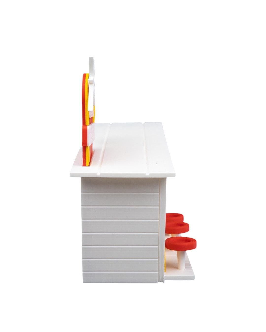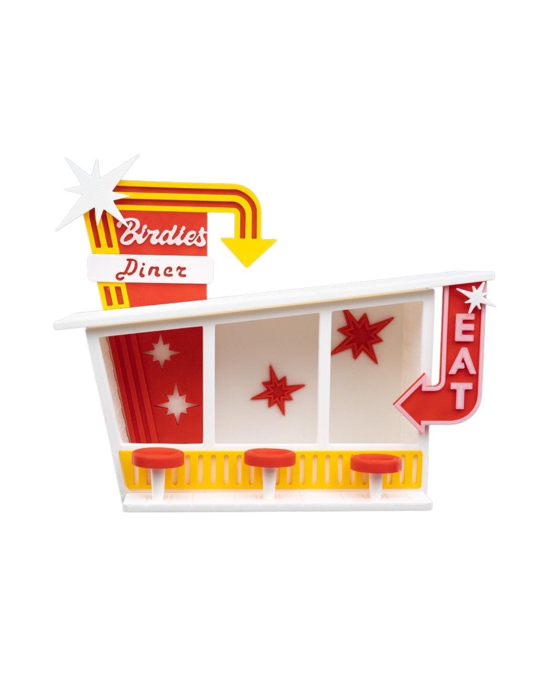 • Unique 1950s Aesthetic – Styled with nostalgic neon-inspired signage, bold colors, and tiny diner stools.